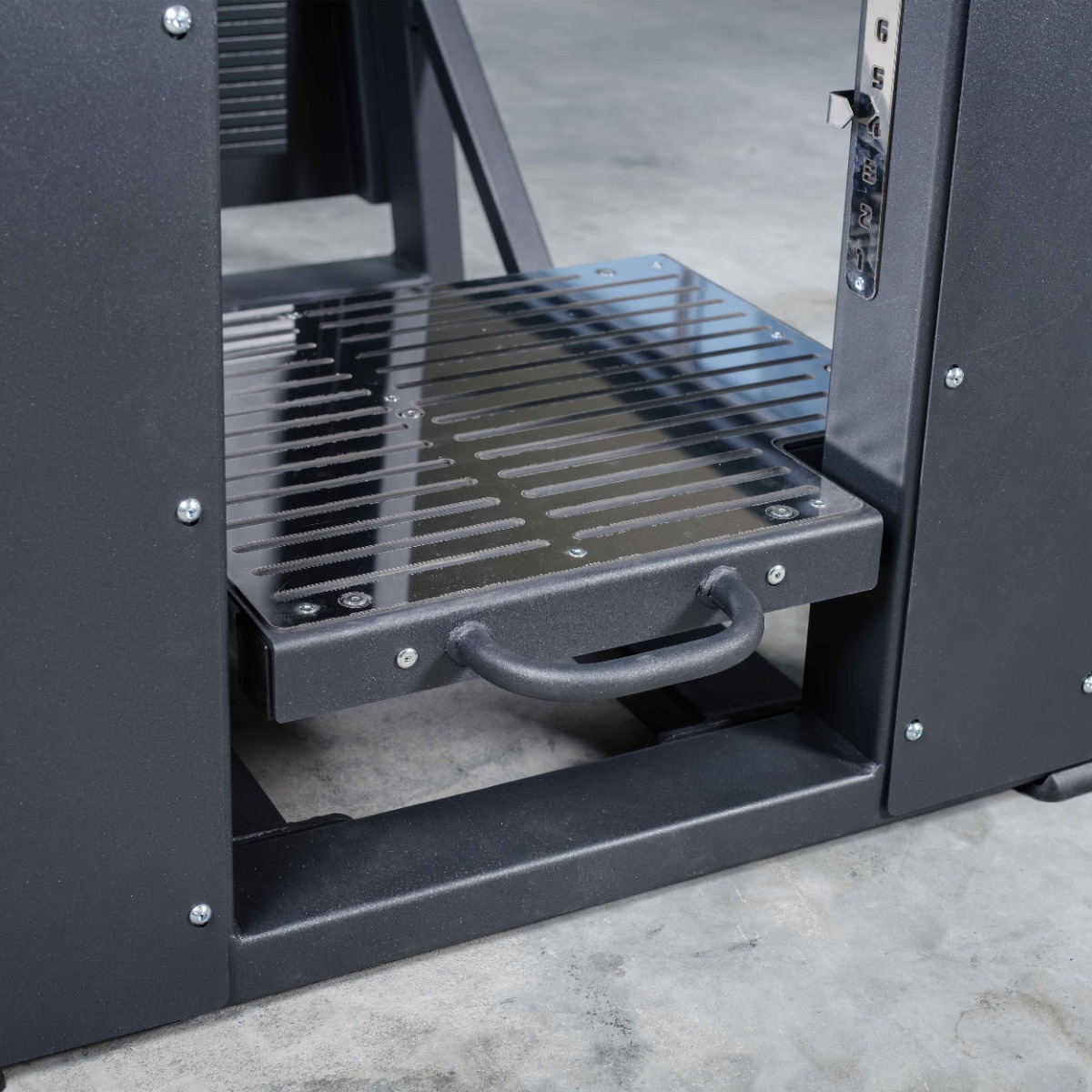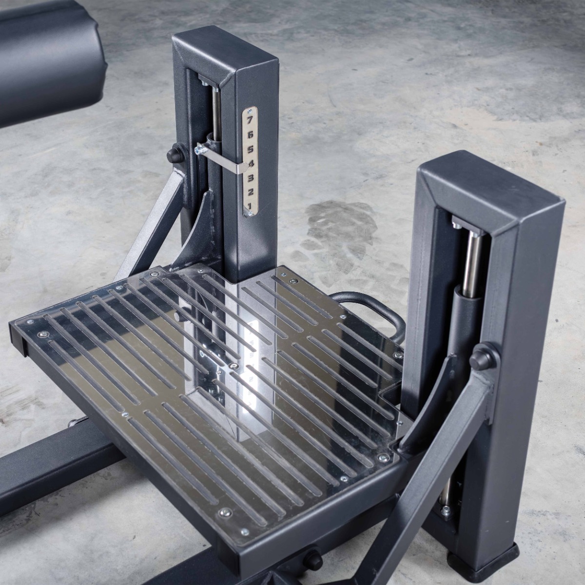 Платформа для ног выполнена цельной, горизонтальной, оснащена двумя металлическими пластинами с рифлёной поверхностью для повышения сцепления и защиты рабочей зоны от износа.