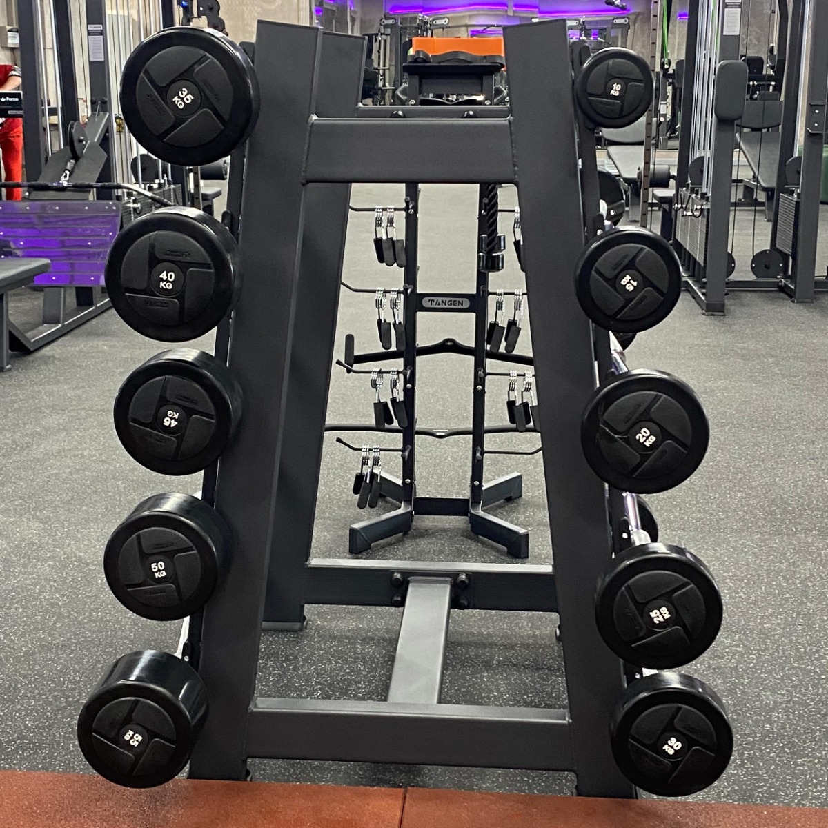 Профессиональная стойка для коммерческого использования A3055 Стойка для штанг (на 10 шт.) предназначена для безопасного и компактного хранения грифов и неразборных штанг различного типа. Конструкция обеспечивает удобный доступ, экономит пространство и поддерживает порядок в зоне свободных весов.