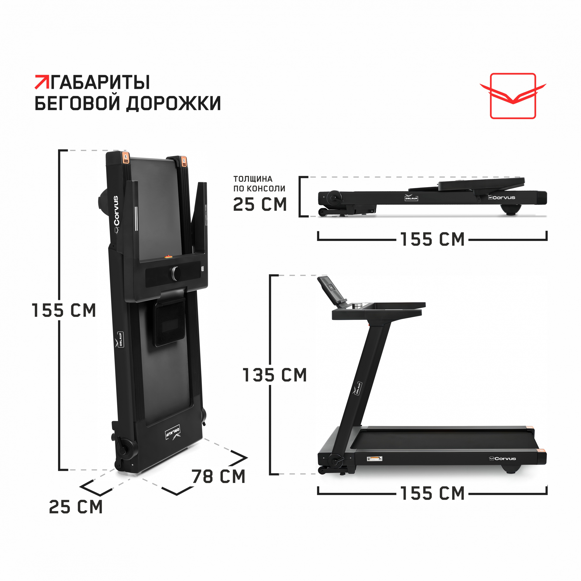 Беговая дорожка Orlauf Corvus — функциональное решение для домашних тренировок, которое легко впишется в любой интерьер. Компактное складывание до толщины 25 см позволяет хранить дорожку вертикально или горизонтально, экономя пространство. Это удобный выбор для тех, кто ценит компактность и эффективность тренажера в условиях ограниченной площади.