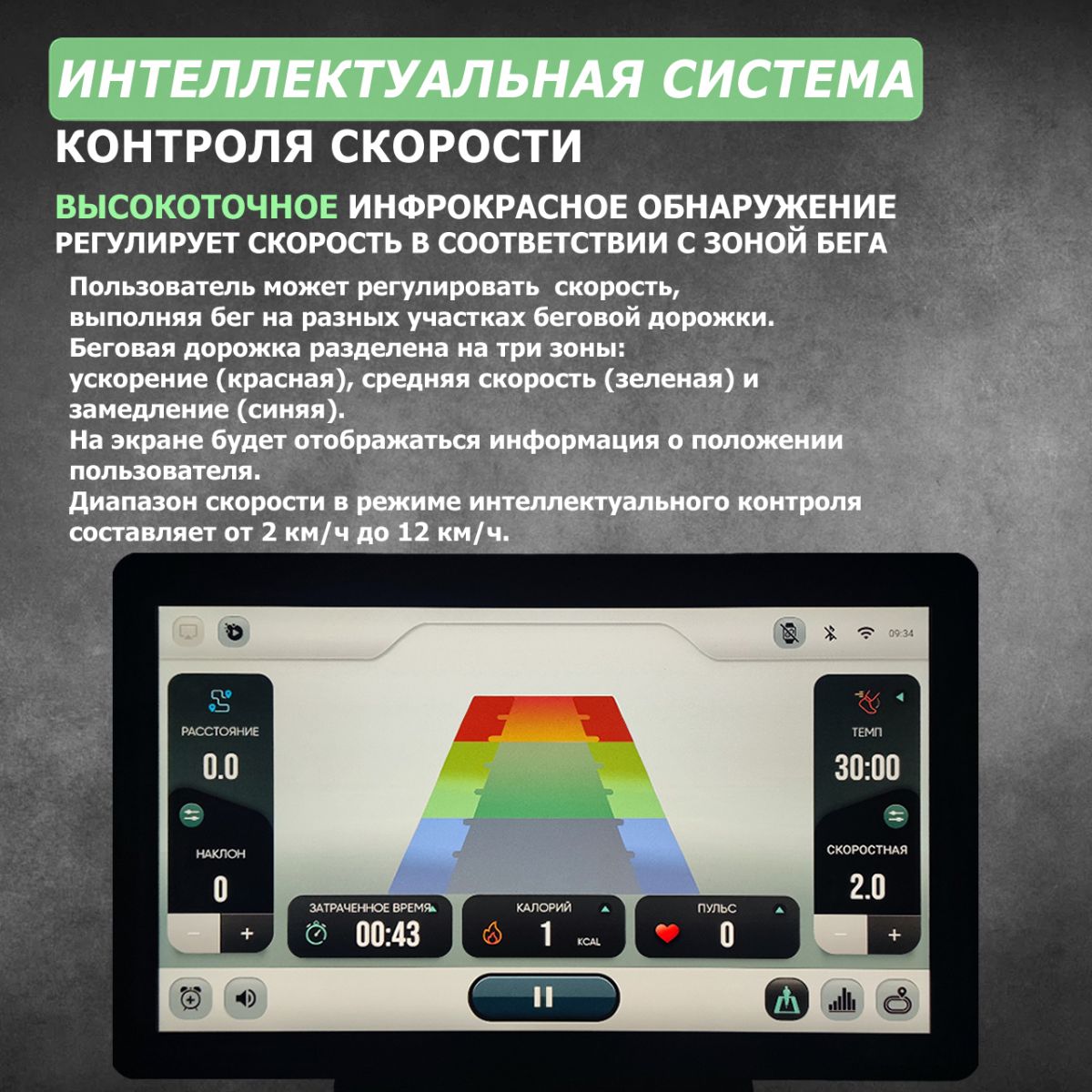 | Интеллектуальная система контроля скорости | Высокоточное инфракрасное обнаружение, регулирует скорость в соответствии с зоной бега пользователя (2-12км/ч) |