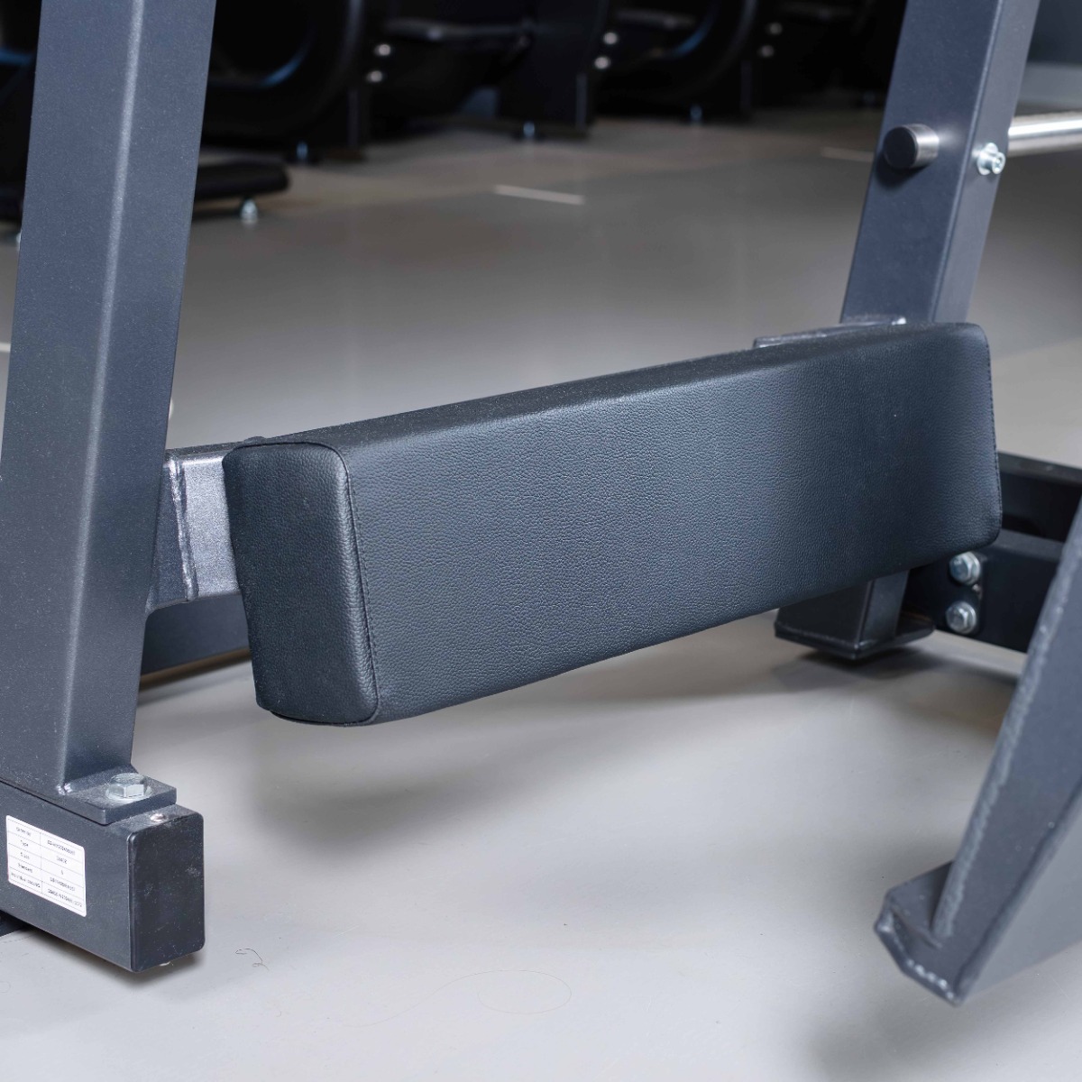 На раме тренажера для хранения дисков с посадочным диаметром 50 мм установлен один хромированный накопитель из толстостенной стальной трубы длиной 265 мм (рабочая длина 245 мм без учета заглушек и демпферов) с пластиковой заглушкой.