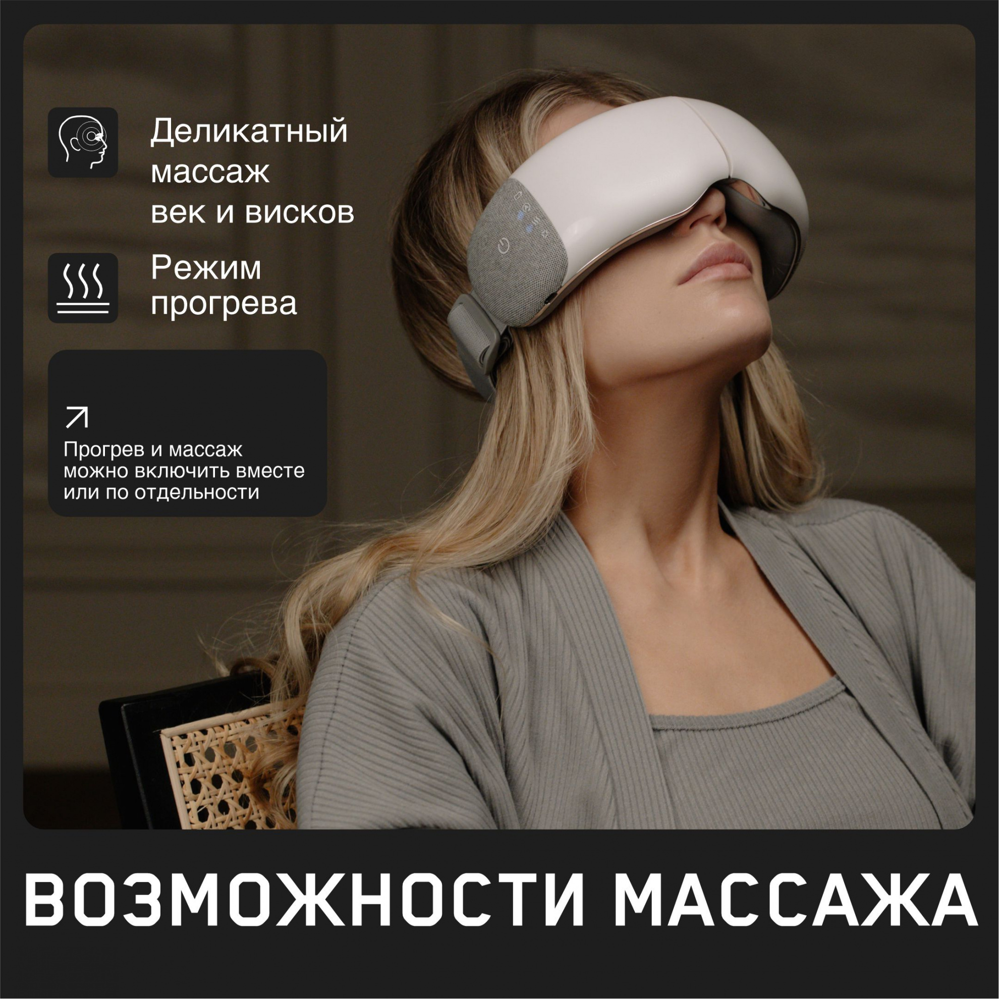 Маска может работать в трех режимах: включены только подушки, включен только прогрев и последний режим — когда массаж подушками дополнен прогреванием. Подбирайте себе режим, который поможет настроиться на дальнейшую работу или, наоборот, подготовит ко сну.
