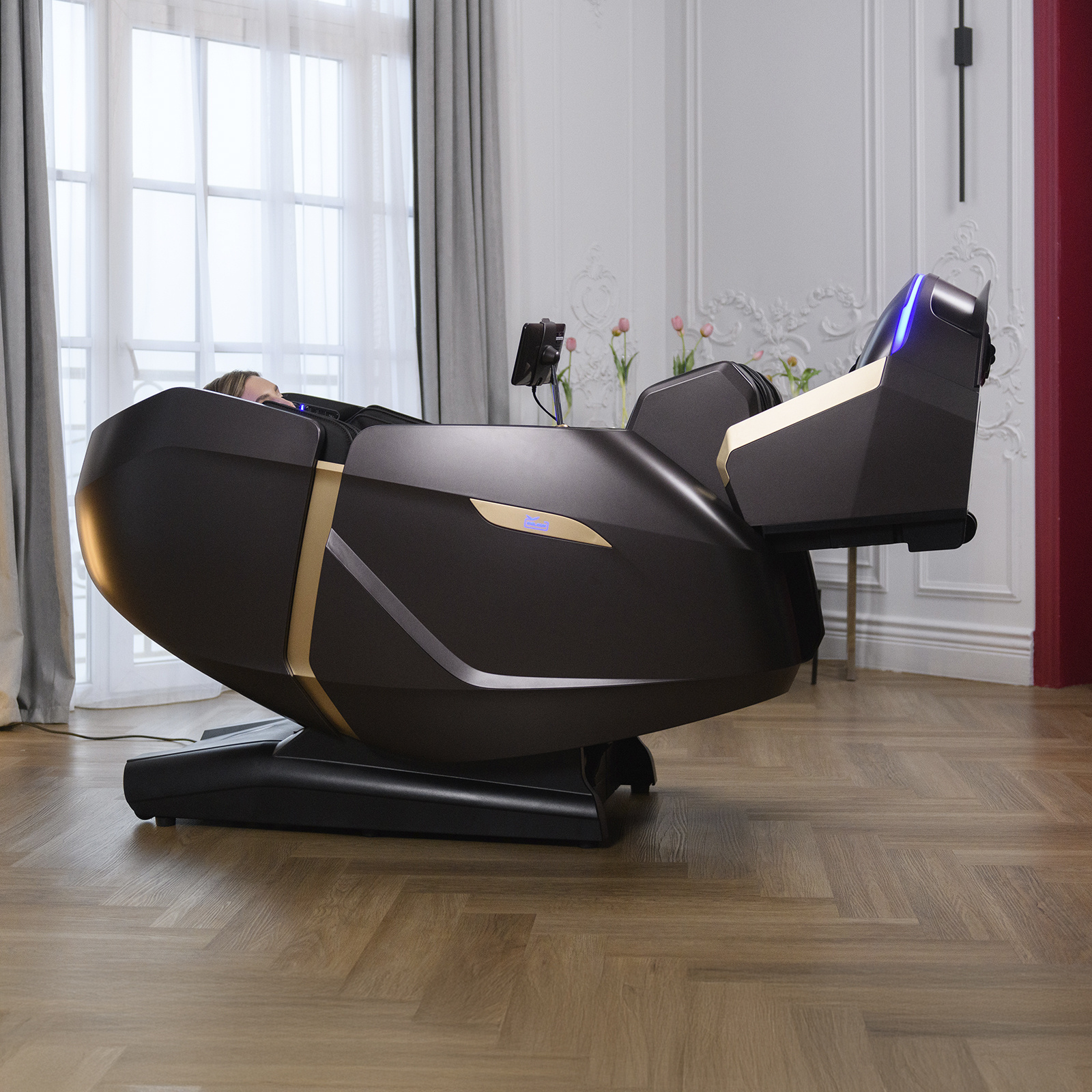 Электрическое массажное кресло для дома Orlauf Angel сочетает передовые технологии массажа и стильный элемент интерьера. Изысканный дизайн и премиальная отделка LuxusLeder из долговечных, легко очищаемых материалов превращают его в настоящее украшение любого помещения.