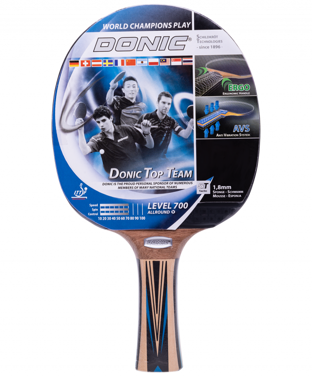 Ракетка Top Team 700 от всемирно известного немецкого бренда Donic-Schildkröt является универсальным инструментом в игре благодаря идеально сбалансированным показателям контроля, скорости и вращения. Эргономическая форма рукоятки позволяет избежать давления в руке для максимального комфорта в игре. Благодаря технологии AVS (Anti-Vibration-System) достигается улучшенный контроль мяча и снижение вибраций, вызванных ударом мяча, в результате чего повышается точность попаданий.