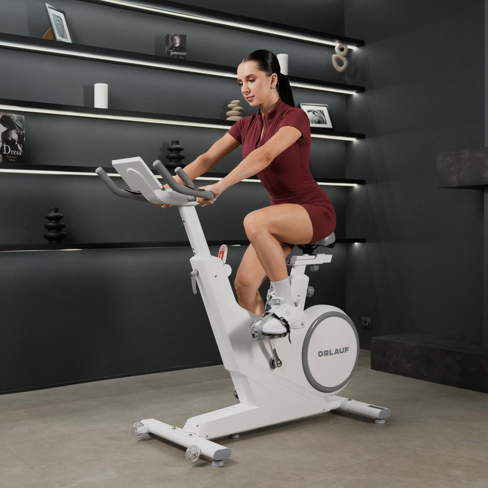 Orlauf Ares поддерживает работу с приложениями Kinomap, Zwift, которое расширяет возможности для тренировок. Стильный дизайн в цвете Ares Cloud придает велотренажеру современный вид, позволяя ему гармонично вписаться в любой интерьер.