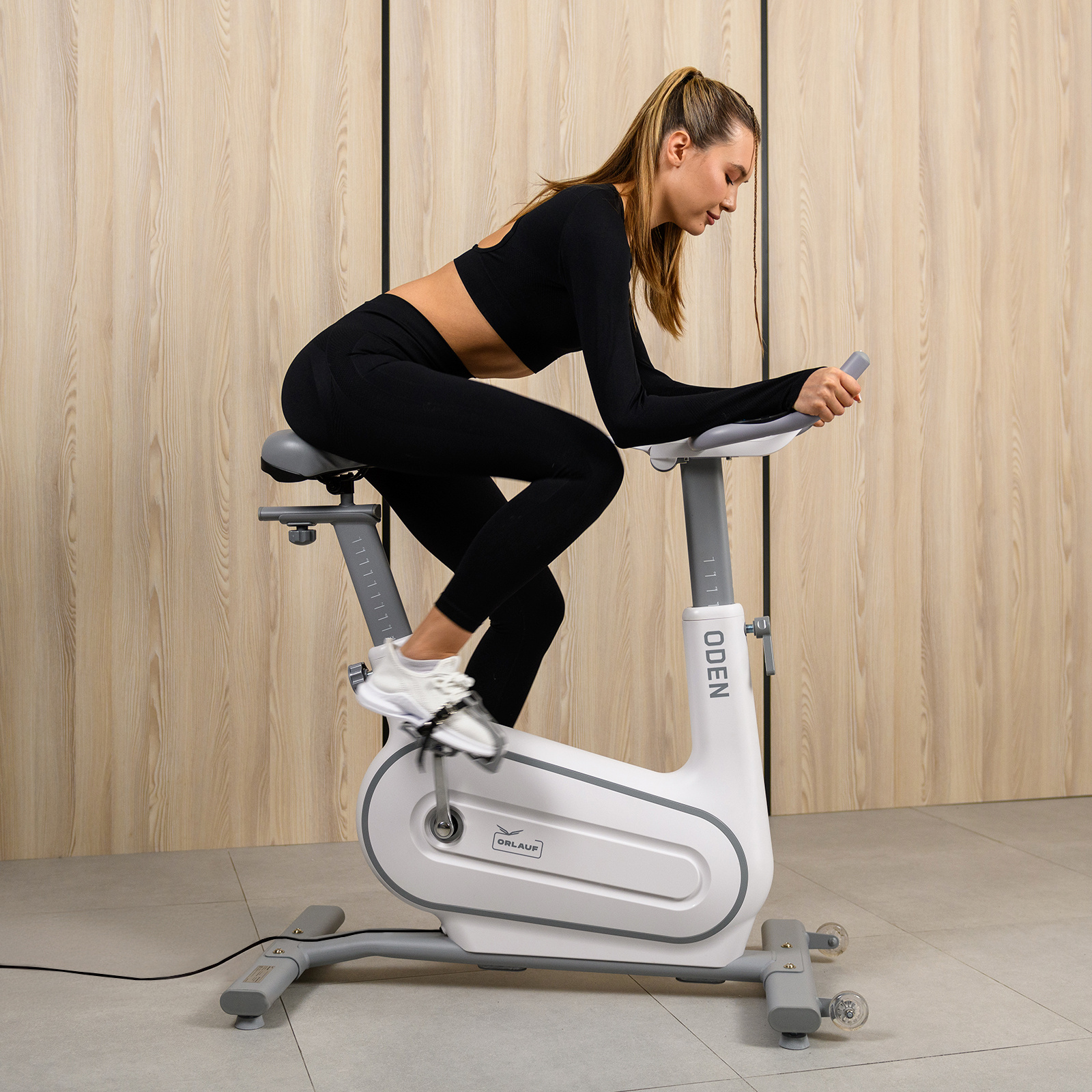 Orlauf Oden имеет вертикальную посадку, способствующую проработке мышц ног и укреплению сердечно-сосудистой системы. Возможность регулировки положения сиденья и руля делает тренажер подходящим для пользователей ростом до 200 см.