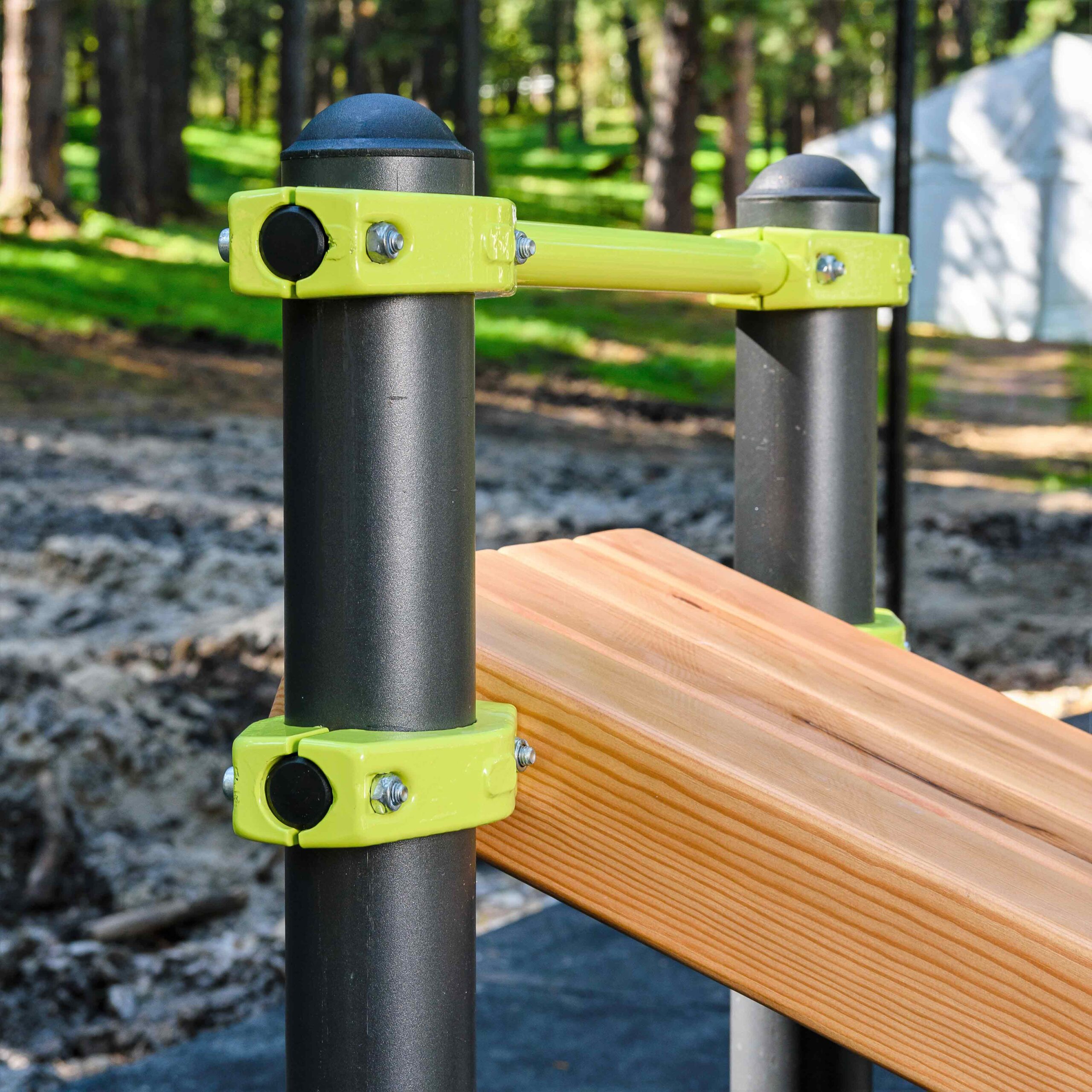 Элементы фиксируются к опорным столбам с помощью надёжных металлических хомутов с болтовым соединением. Конструкция хомутов обеспечивает прочную посадку и равномерное распределение нагрузки, а самоконтрящиеся гайки М10 предотвращают самопроизвольное ослабление креплений в процессе эксплуатации.